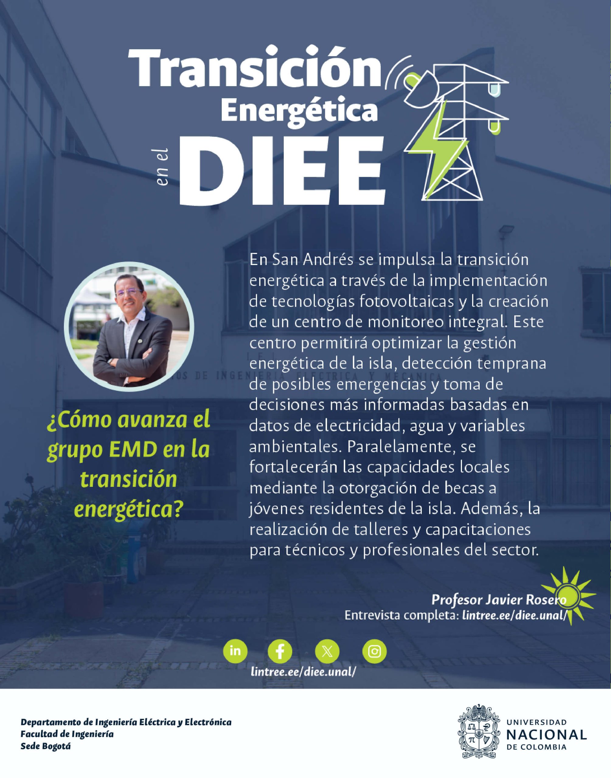 En la isla de San Andrés, se encuentra en un avance del 50% de ejecución, proyecto de regalías de 8000 mil millones. Se busca implementar tecnologías de generación fotovoltaico, que busca y permita generar ese propósito de operación del suministro de energía e integración a la red, pero también todo el tema de datos y más que puedan surgir con ese potencial de generación fotovoltaico a partir de la implementación, medición y automatización de todos los sensores que pretendemos desplegar, también, está la parte de movilidad eléctrica de vehículos y scooter que se despliegan dentro de la Isla de San Andrés.