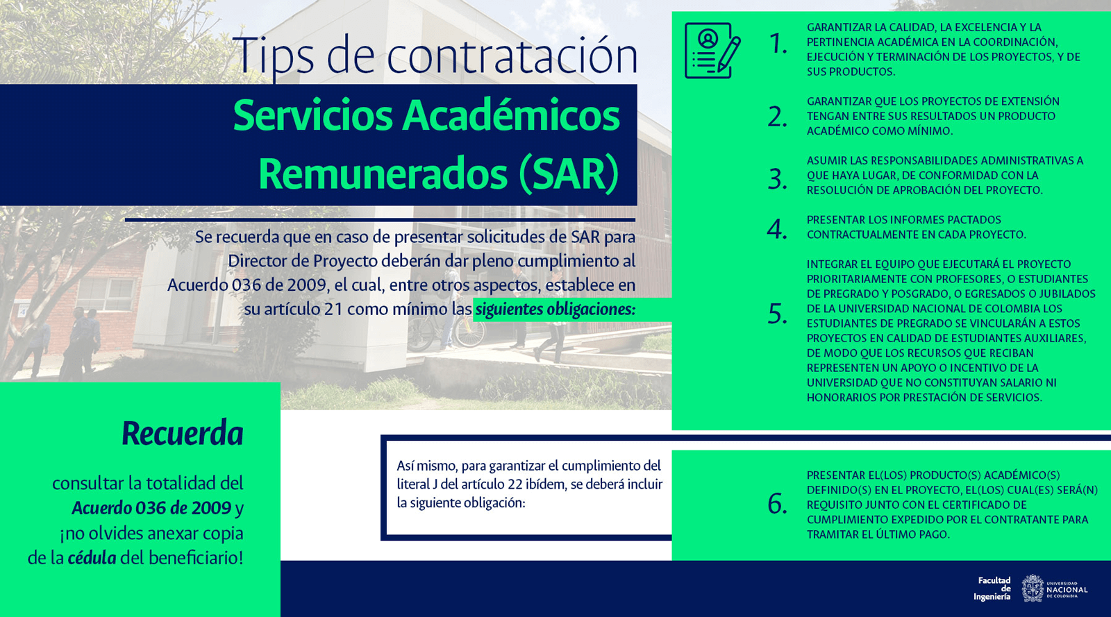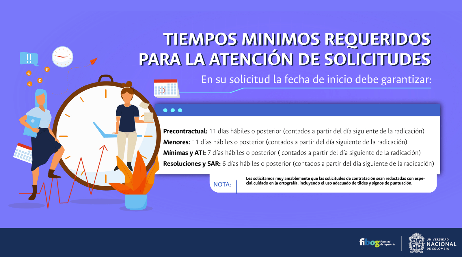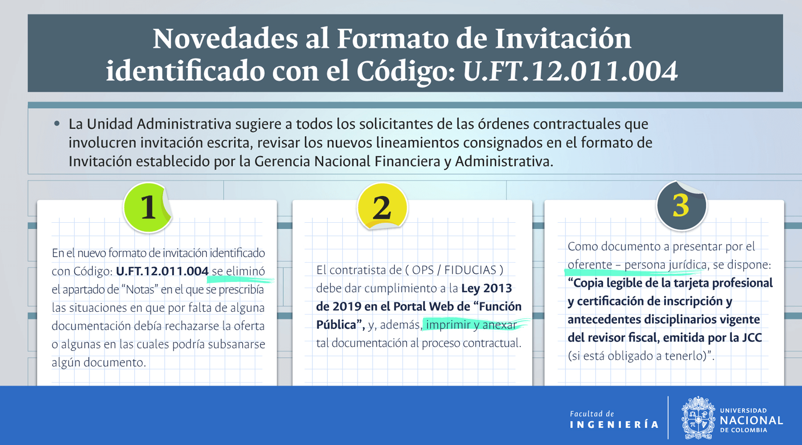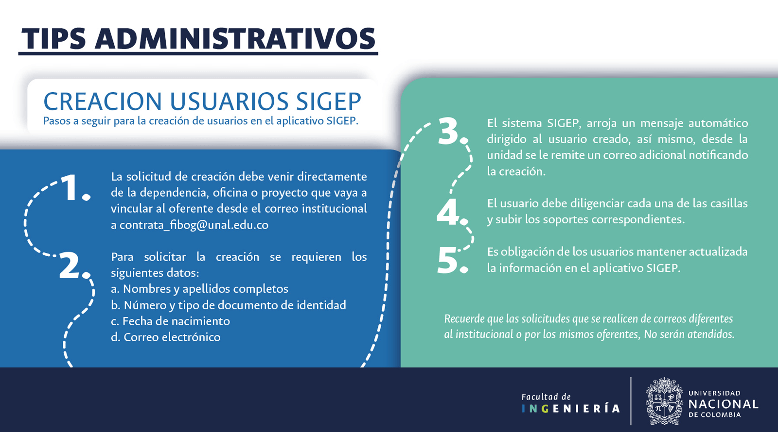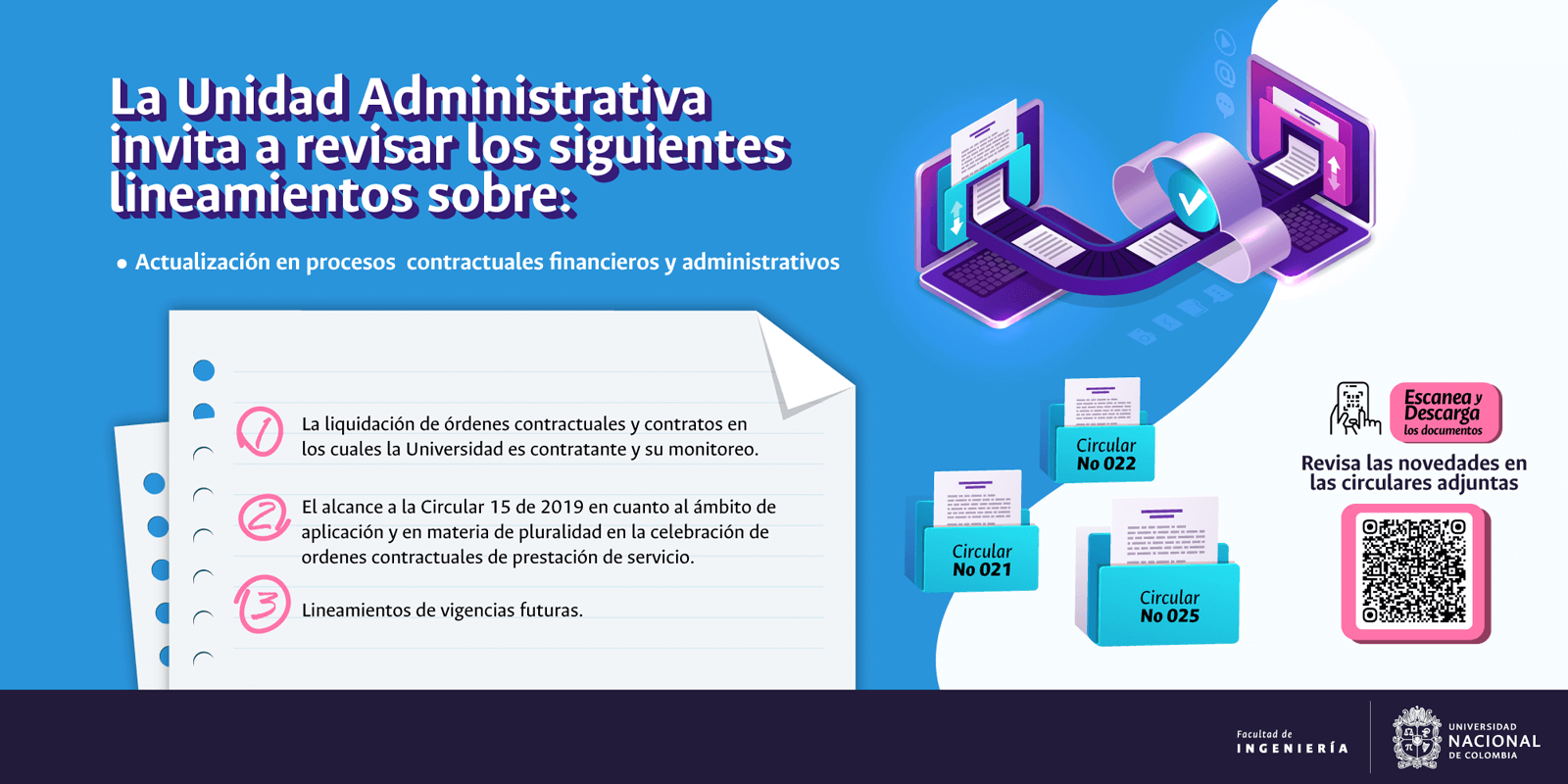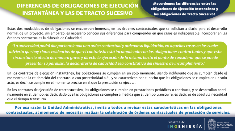 De acuerdo con lo anterior, recomendamos al público en general y a nuestros proveedores tener en cuenta que la Universidad Nacional de Colombia NO solicita la entrega o despacho de bienes o equipos, sin antes haber adelantado todo un proceso contractual, escrito y formal, que toma varios días hábiles. Por lo tanto, desconfíe de cualquier comunicación que, en nombre de la Universidad, le pida algún tipo de entrega por adelantado de bienes o equipos, con la promesa de la futura contratación y pago, y de manera inmediata, proceda a informar a las autoridades respectivas y, a la Universidad al Conmutador 3165000 Exts. 18180-18155 o a los correos electrónicos: contratacion@unal.edu.co o gernalfa_nal@unal.edu.co.