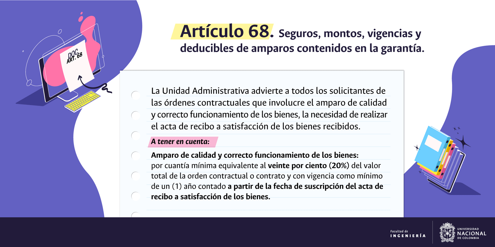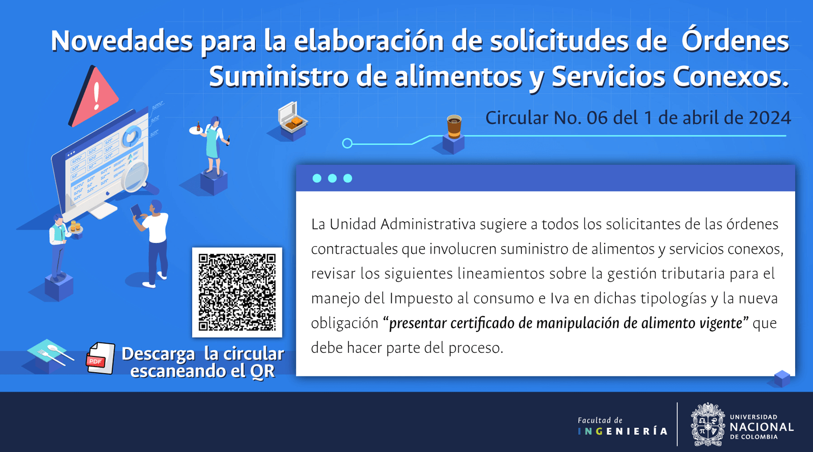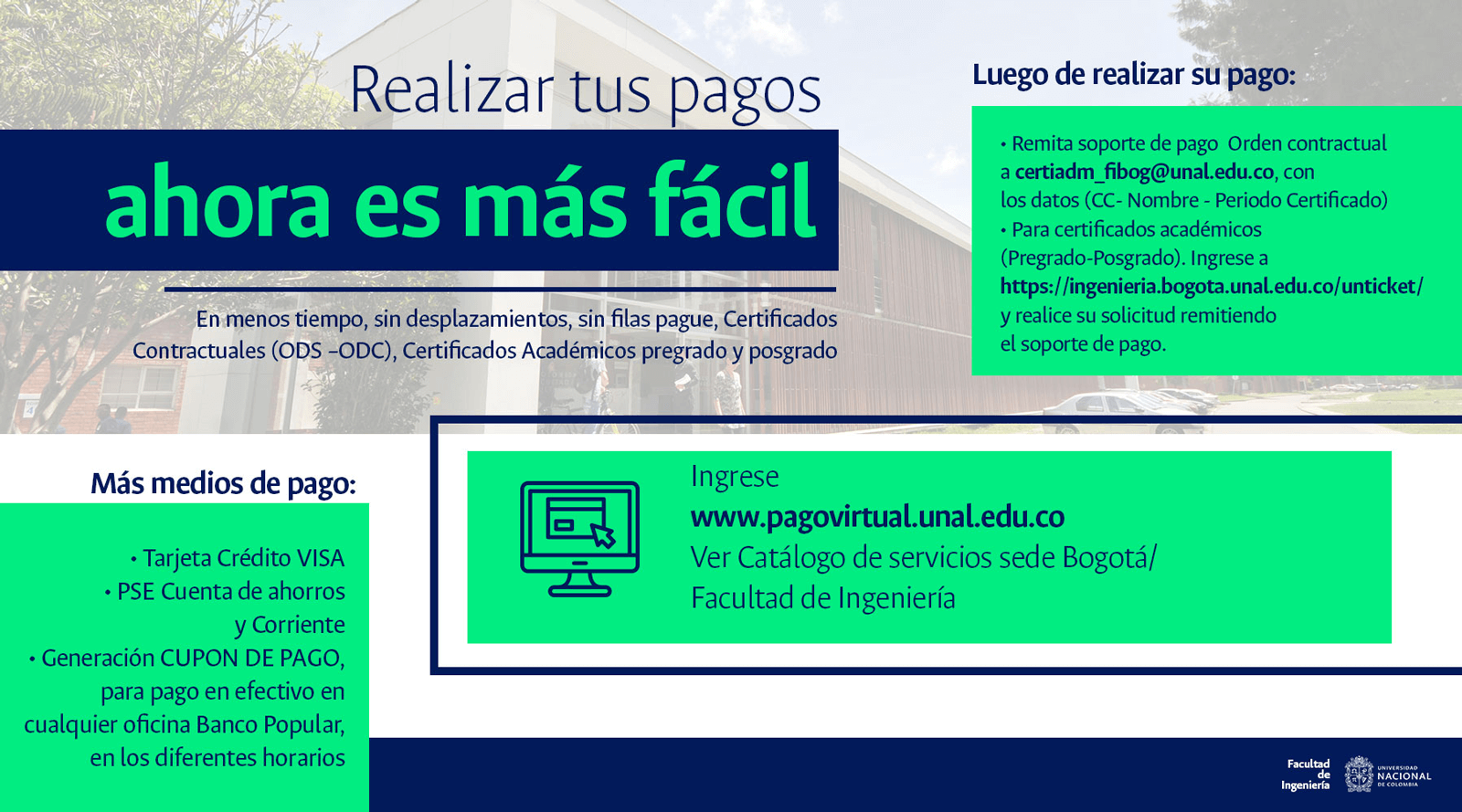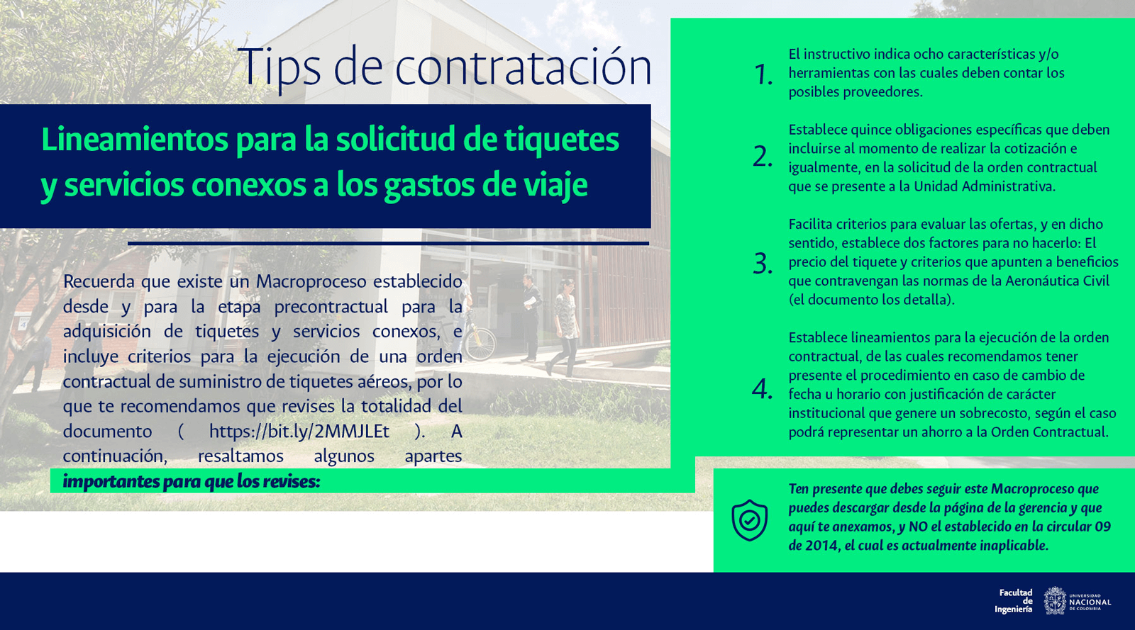 De acuerdo con lo anterior, recomendamos al público en general y a nuestros proveedores tener en cuenta que la Universidad Nacional de Colombia NO solicita la entrega o despacho de bienes o equipos, sin antes haber adelantado todo un proceso contractual, escrito y formal, que toma varios días hábiles. Por lo tanto, desconfíe de cualquier comunicación que, en nombre de la Universidad, le pida algún tipo de entrega por adelantado de bienes o equipos, con la promesa de la futura contratación y pago, y de manera inmediata, proceda a informar a las autoridades respectivas y, a la Universidad al Conmutador 3165000 Exts. 18180-18155 o a los correos electrónicos: contratacion@unal.edu.co o gernalfa_nal@unal.edu.co.