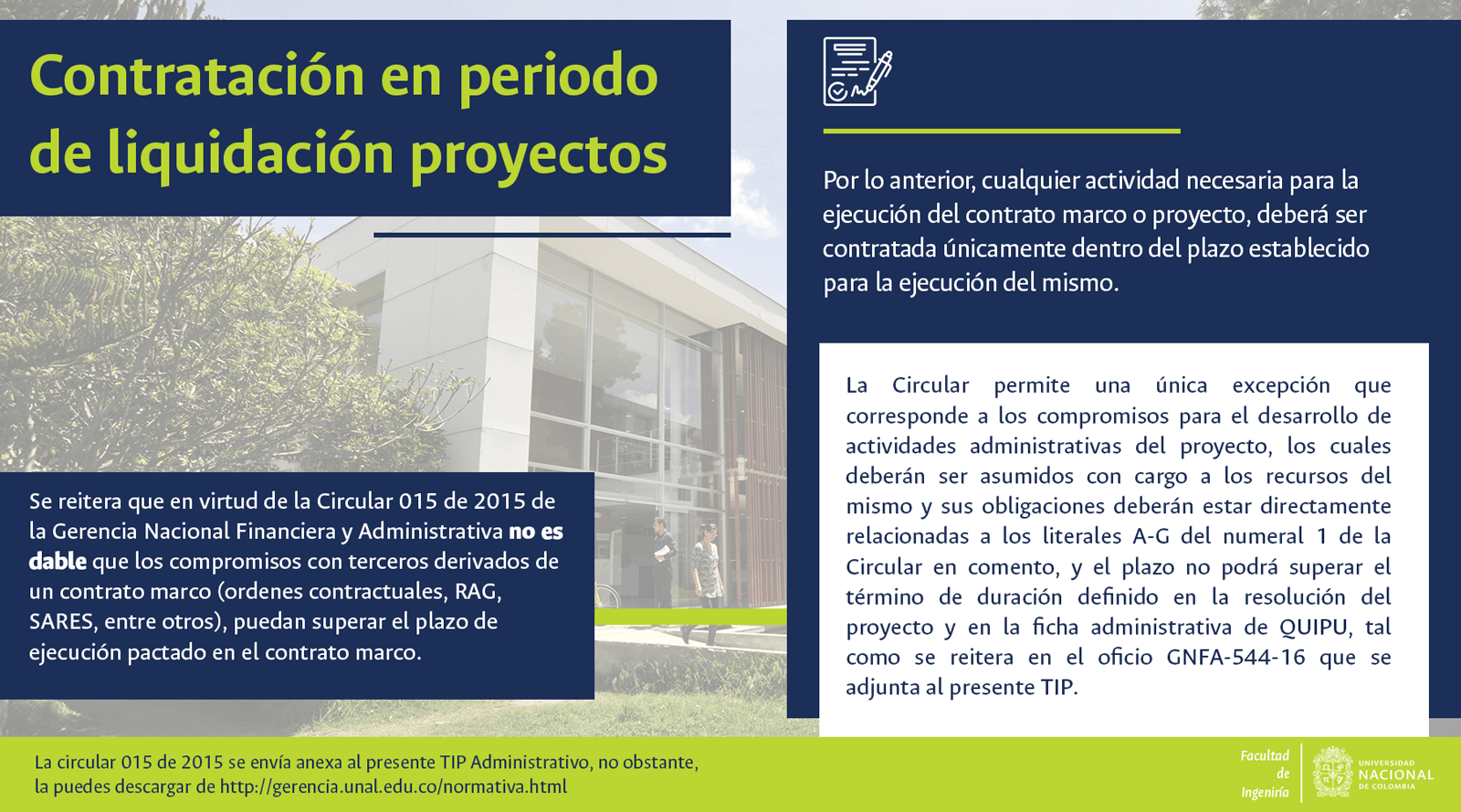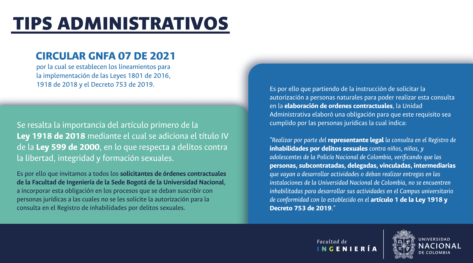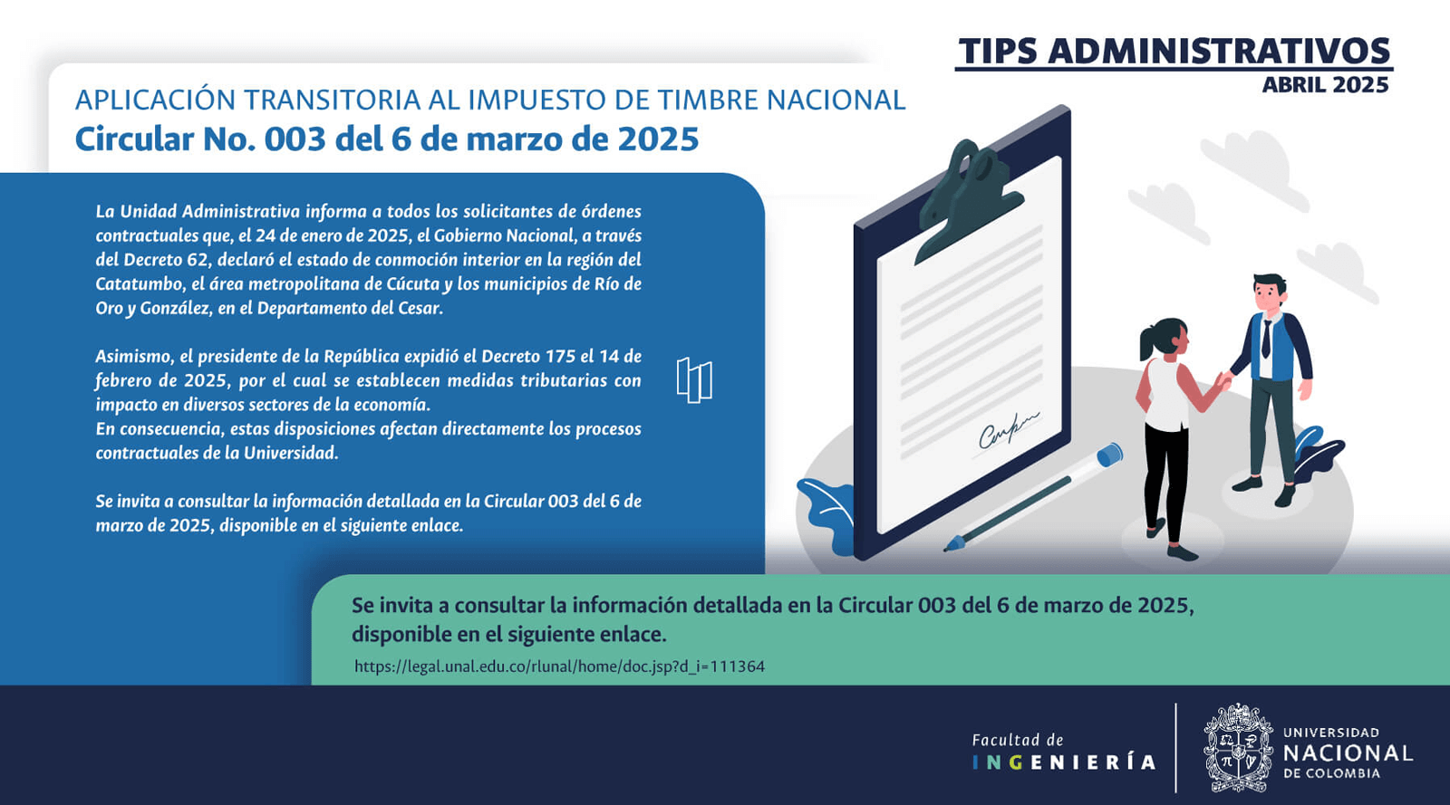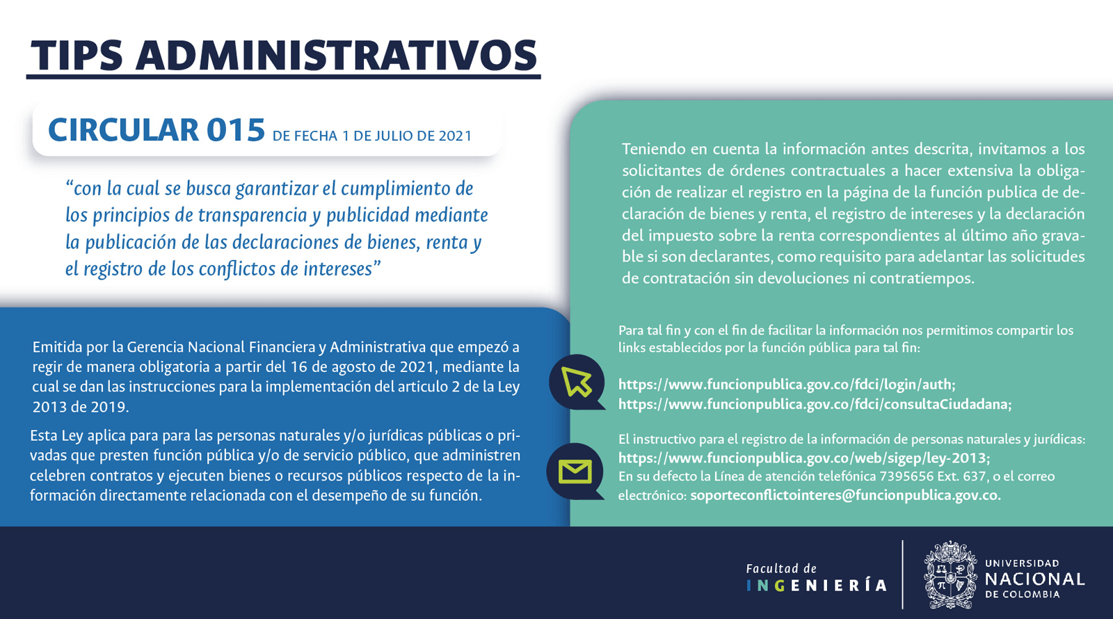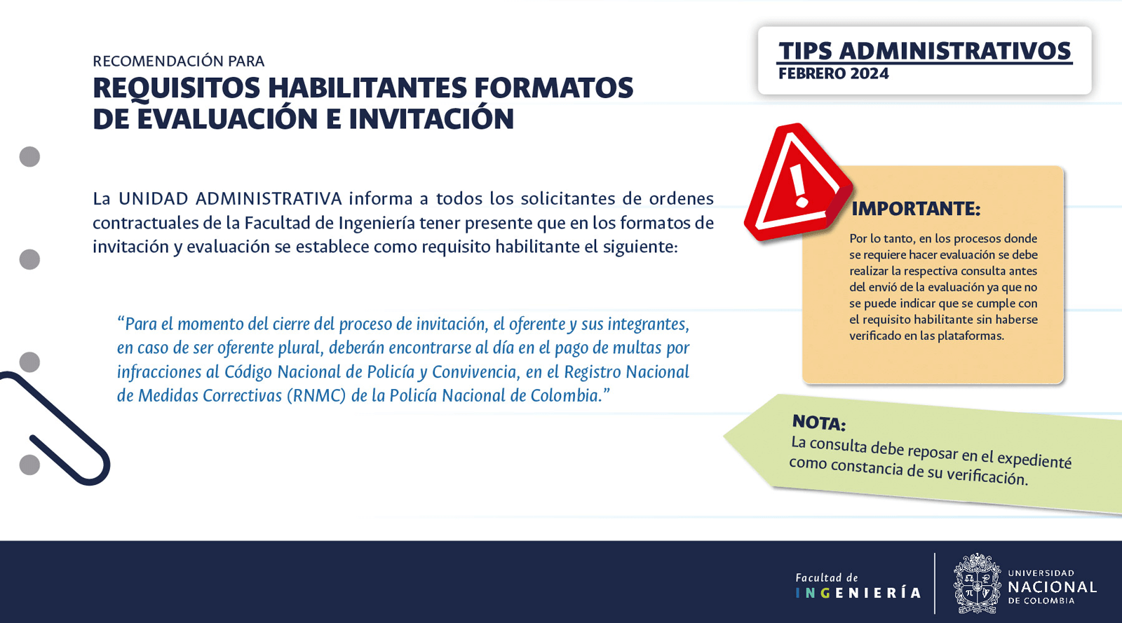 De acuerdo con lo anterior, recomendamos al público en general y a nuestros proveedores tener en cuenta que la Universidad Nacional de Colombia NO solicita la entrega o despacho de bienes o equipos, sin antes haber adelantado todo un proceso contractual, escrito y formal, que toma varios días hábiles. Por lo tanto, desconfíe de cualquier comunicación que, en nombre de la Universidad, le pida algún tipo de entrega por adelantado de bienes o equipos, con la promesa de la futura contratación y pago, y de manera inmediata, proceda a informar a las autoridades respectivas y, a la Universidad al Conmutador 3165000 Exts. 18180-18155 o a los correos electrónicos: contratacion@unal.edu.co o gernalfa_nal@unal.edu.co.