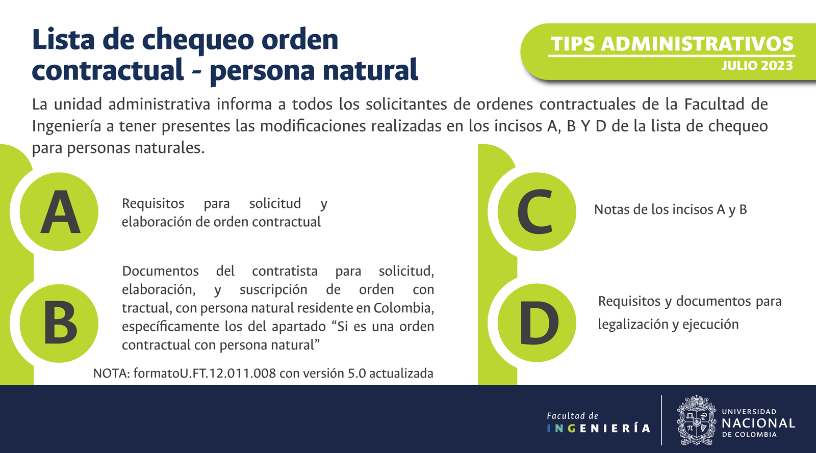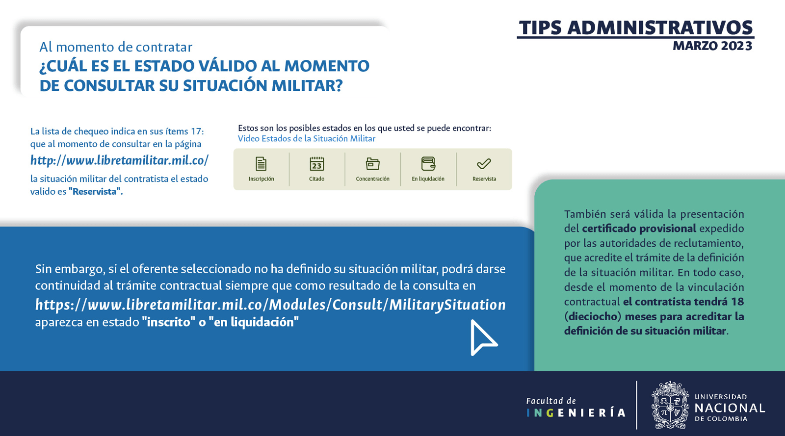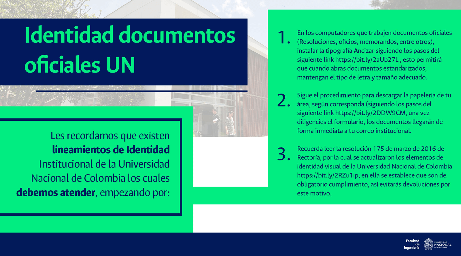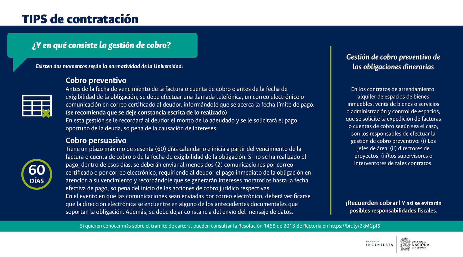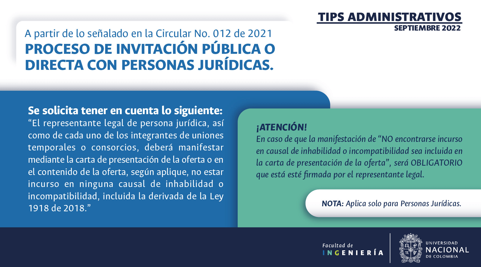 De acuerdo con lo anterior, recomendamos al público en general y a nuestros proveedores tener en cuenta que la Universidad Nacional de Colombia NO solicita la entrega o despacho de bienes o equipos, sin antes haber adelantado todo un proceso contractual, escrito y formal, que toma varios días hábiles. Por lo tanto, desconfíe de cualquier comunicación que, en nombre de la Universidad, le pida algún tipo de entrega por adelantado de bienes o equipos, con la promesa de la futura contratación y pago, y de manera inmediata, proceda a informar a las autoridades respectivas y, a la Universidad al Conmutador 3165000 Exts. 18180-18155 o a los correos electrónicos: contratacion@unal.edu.co o gernalfa_nal@unal.edu.co.