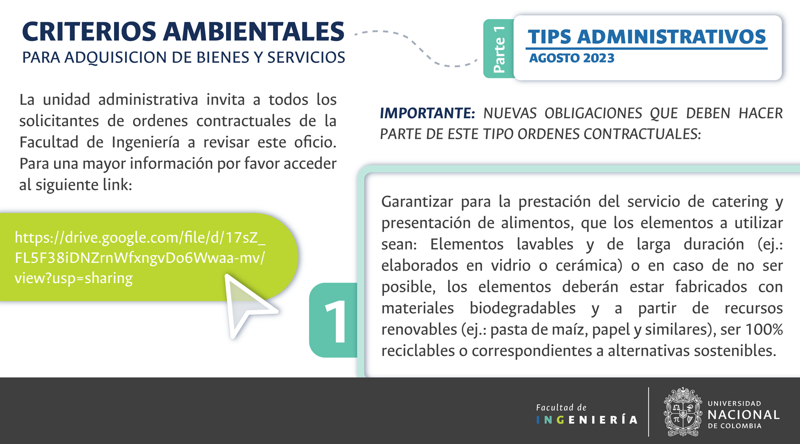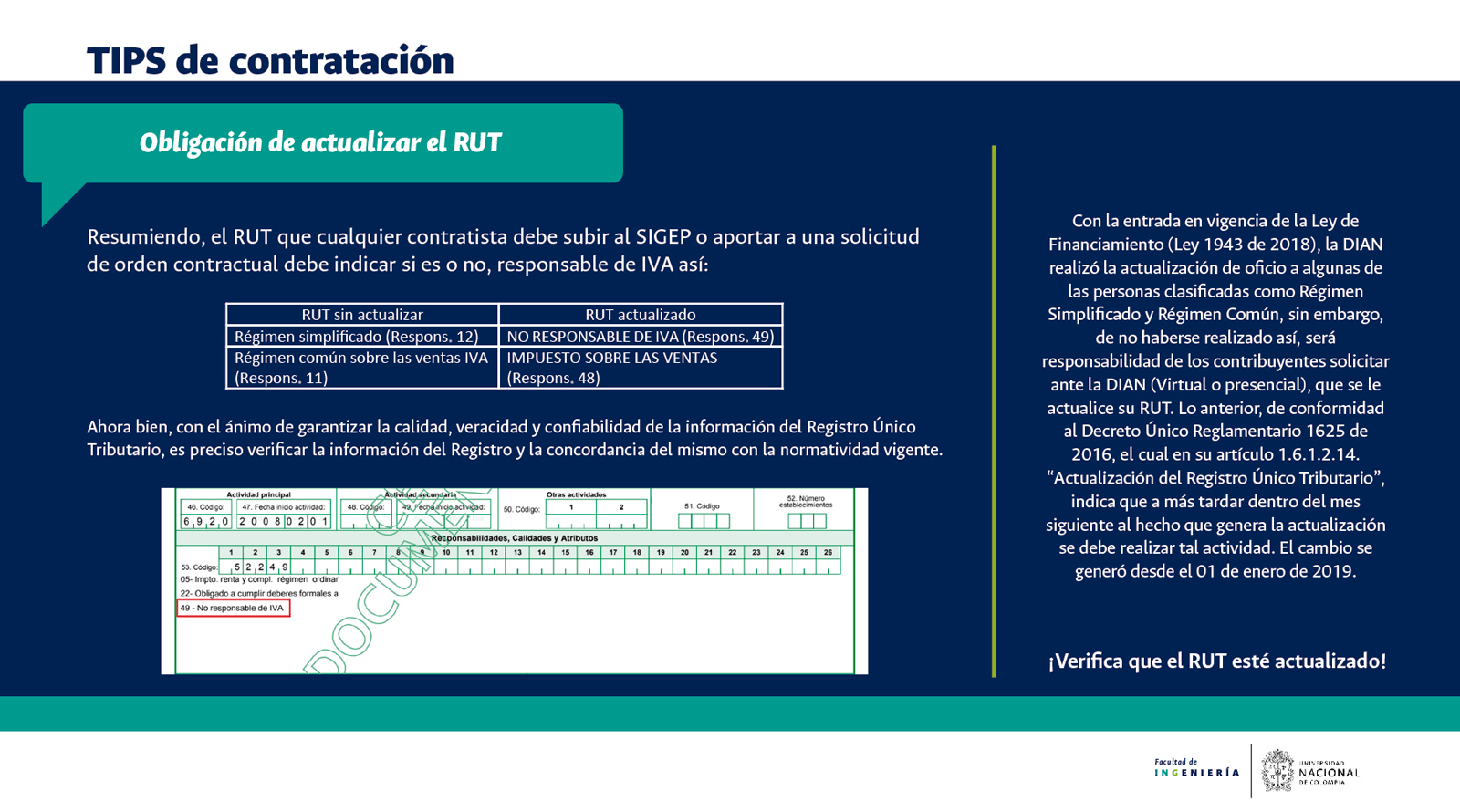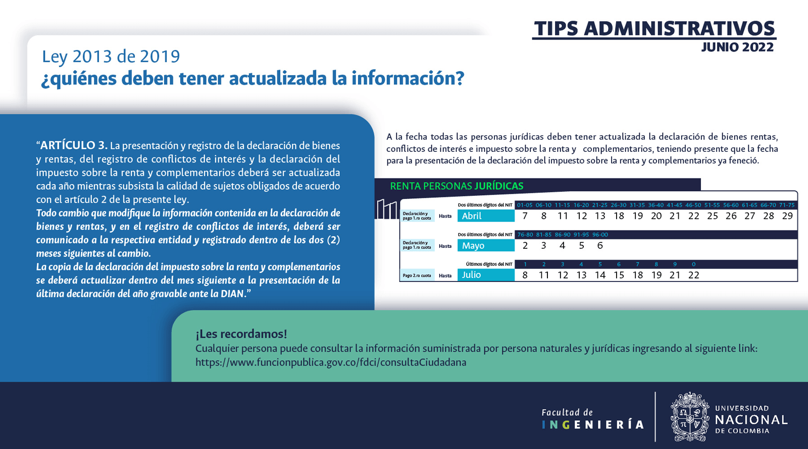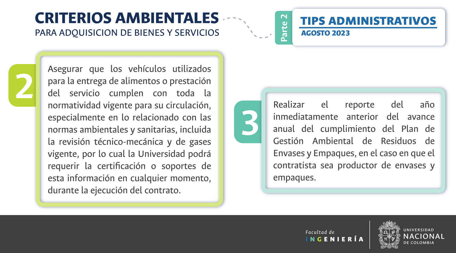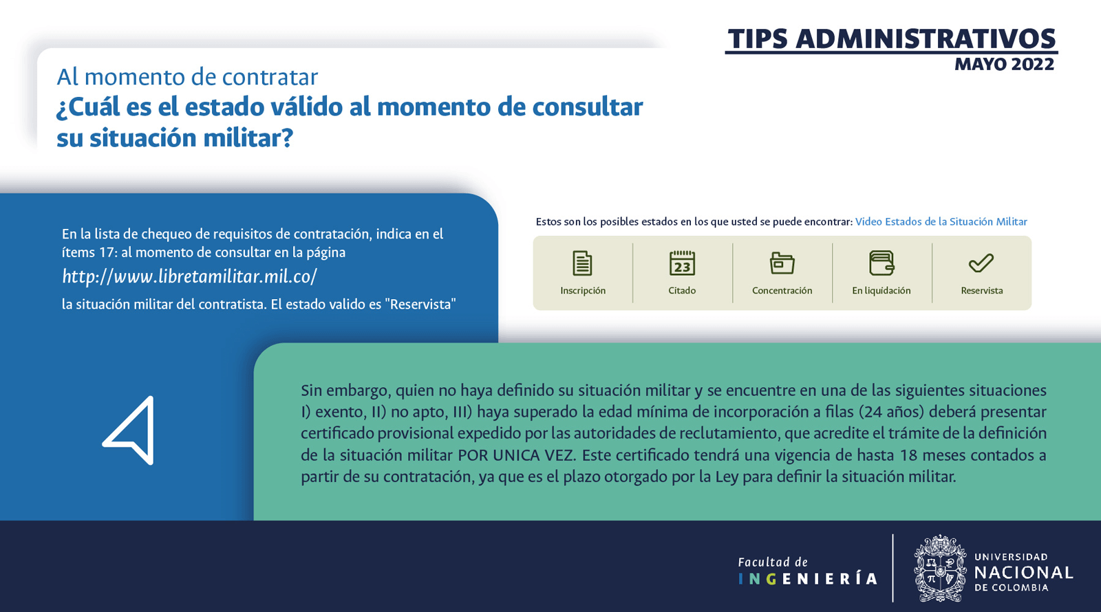 De acuerdo con lo anterior, recomendamos al público en general y a nuestros proveedores tener en cuenta que la Universidad Nacional de Colombia NO solicita la entrega o despacho de bienes o equipos, sin antes haber adelantado todo un proceso contractual, escrito y formal, que toma varios días hábiles. Por lo tanto, desconfíe de cualquier comunicación que, en nombre de la Universidad, le pida algún tipo de entrega por adelantado de bienes o equipos, con la promesa de la futura contratación y pago, y de manera inmediata, proceda a informar a las autoridades respectivas y, a la Universidad al Conmutador 3165000 Exts. 18180-18155 o a los correos electrónicos: contratacion@unal.edu.co o gernalfa_nal@unal.edu.co.