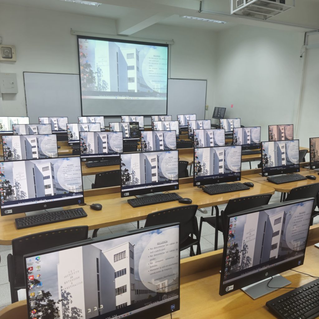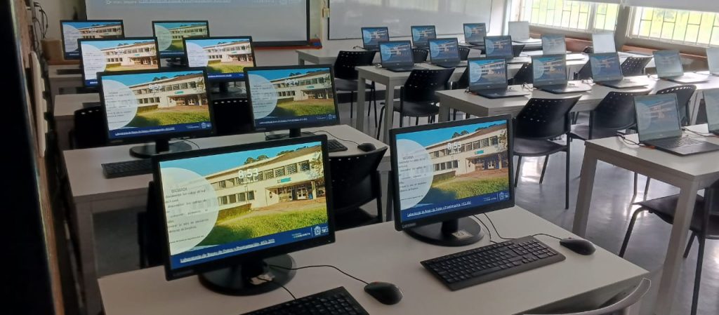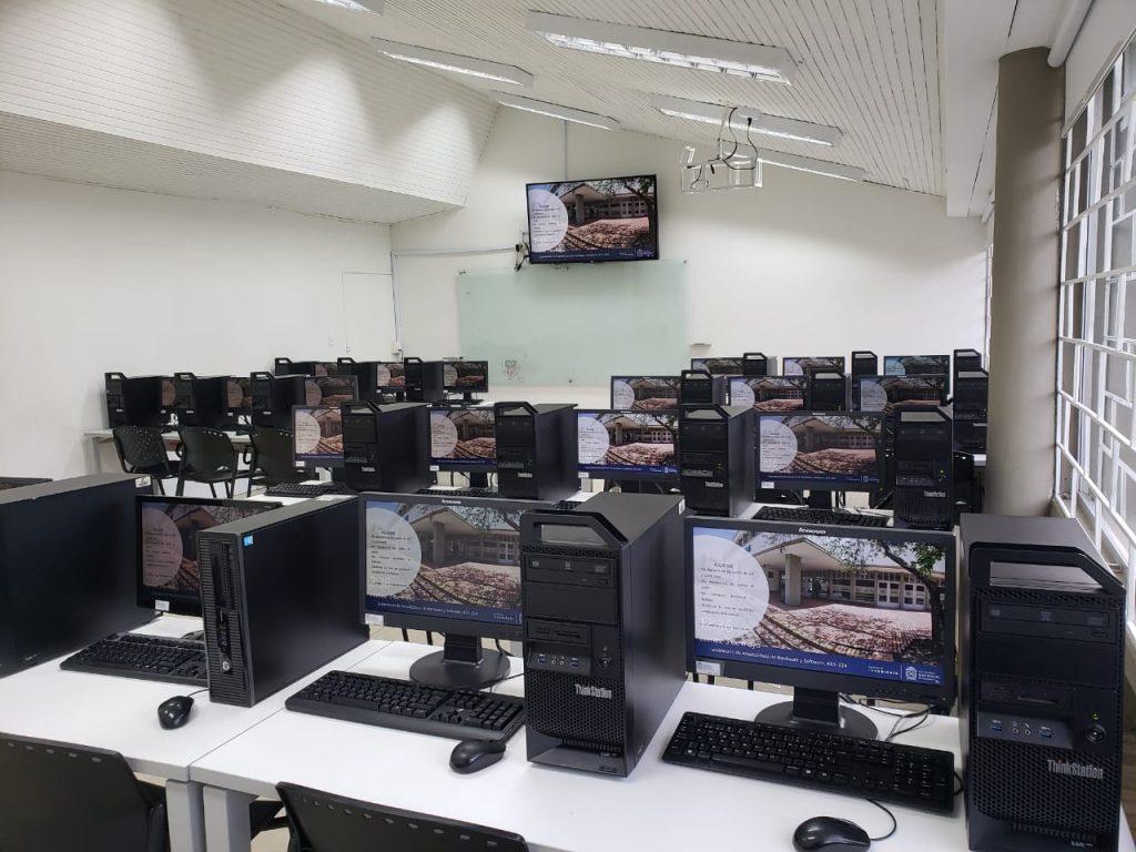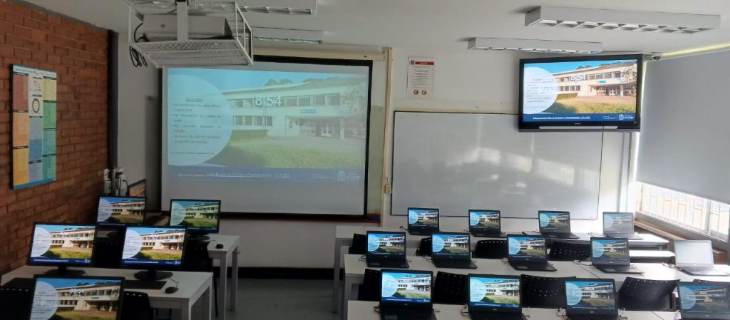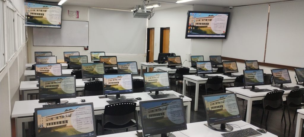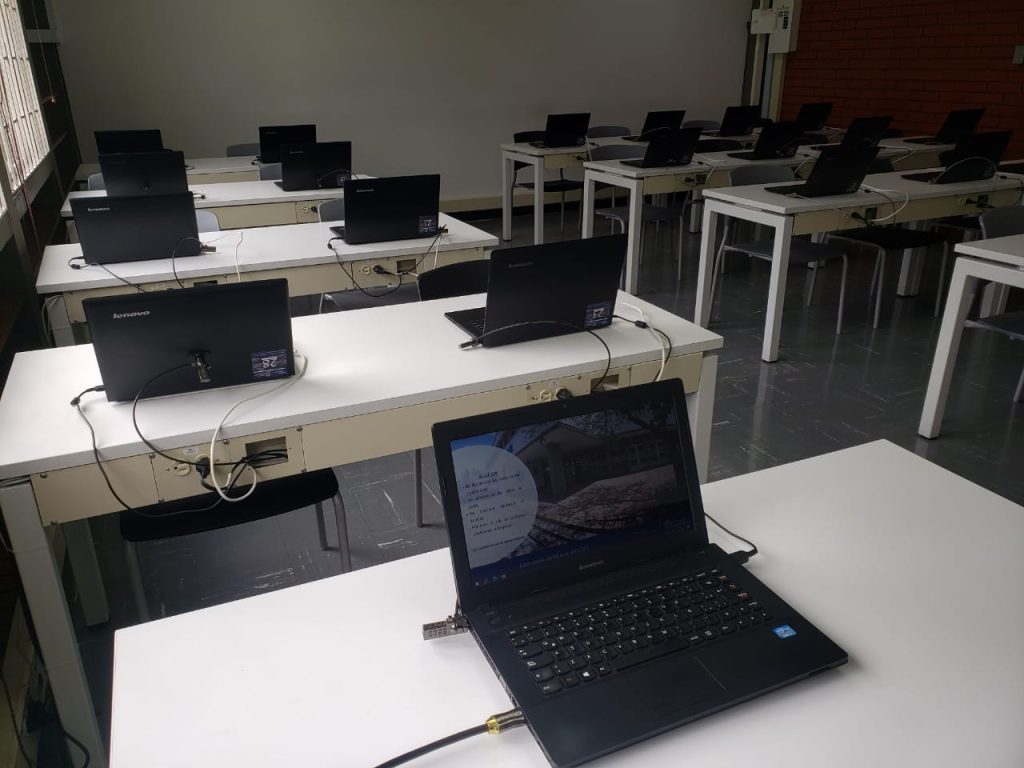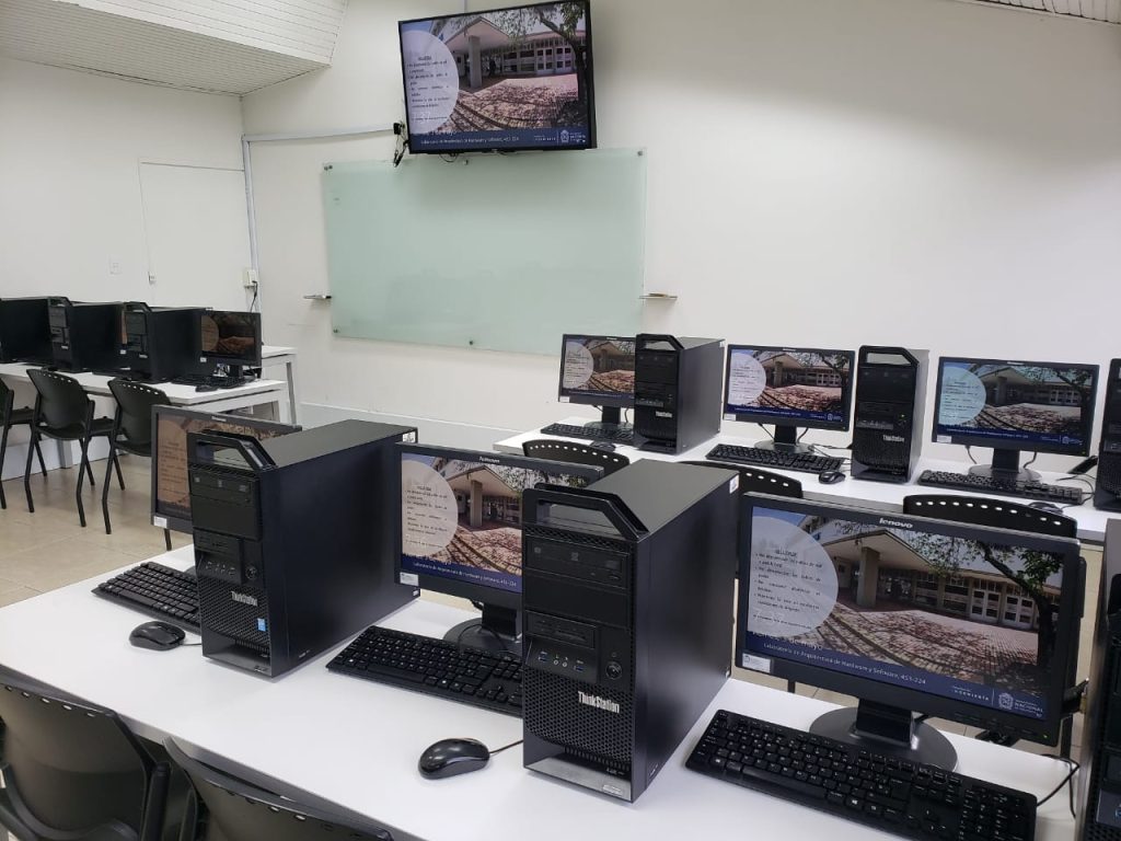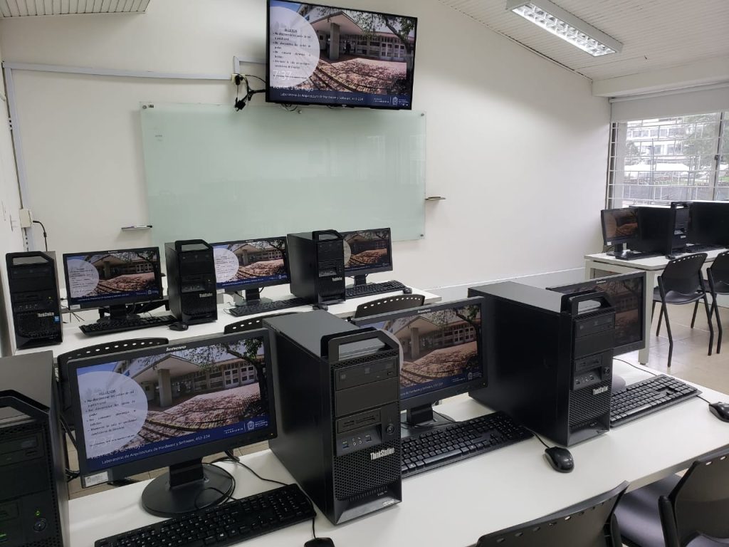 Espacio dedicado a docencia y extensión con equipos modernos (computadores HP, software especializado como Python 3.5, Java, SQL Server, entre otros) y soporte a múltiples cursos y grupos de investigación