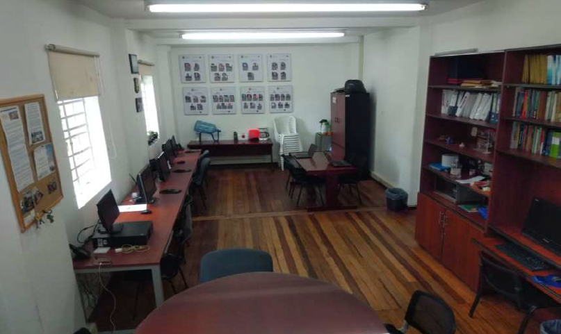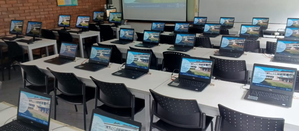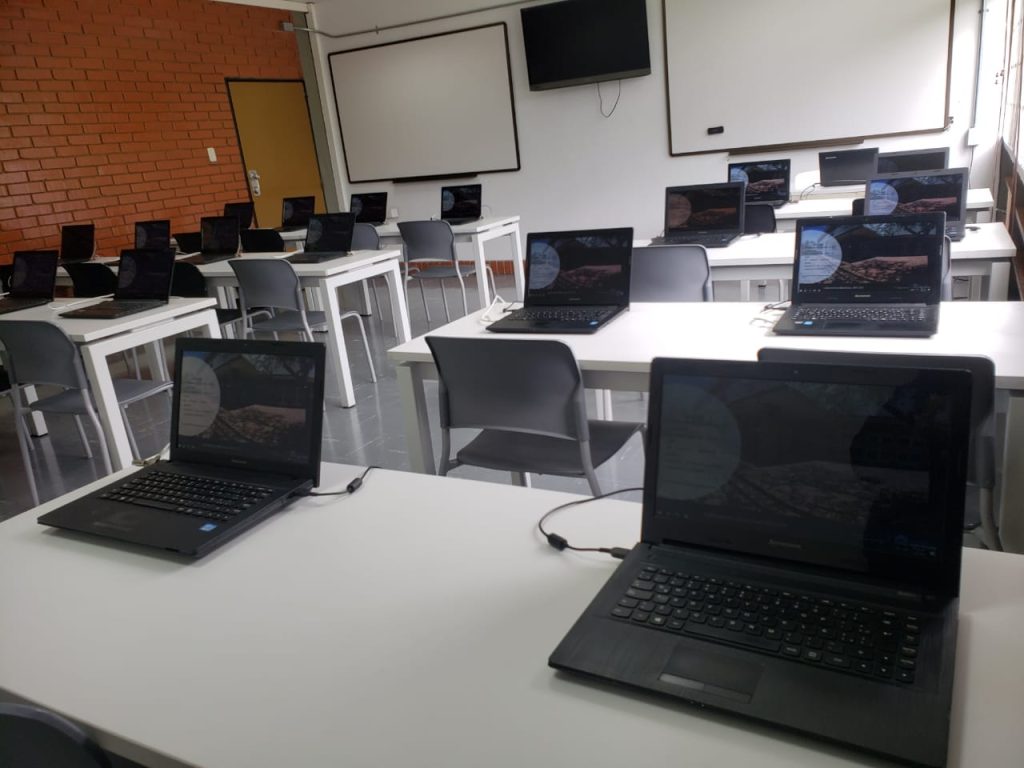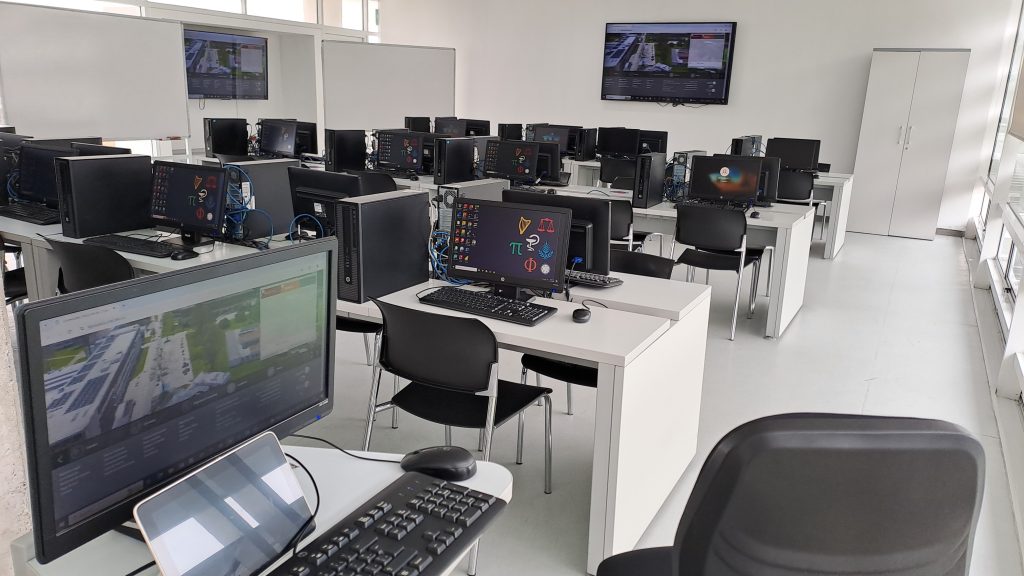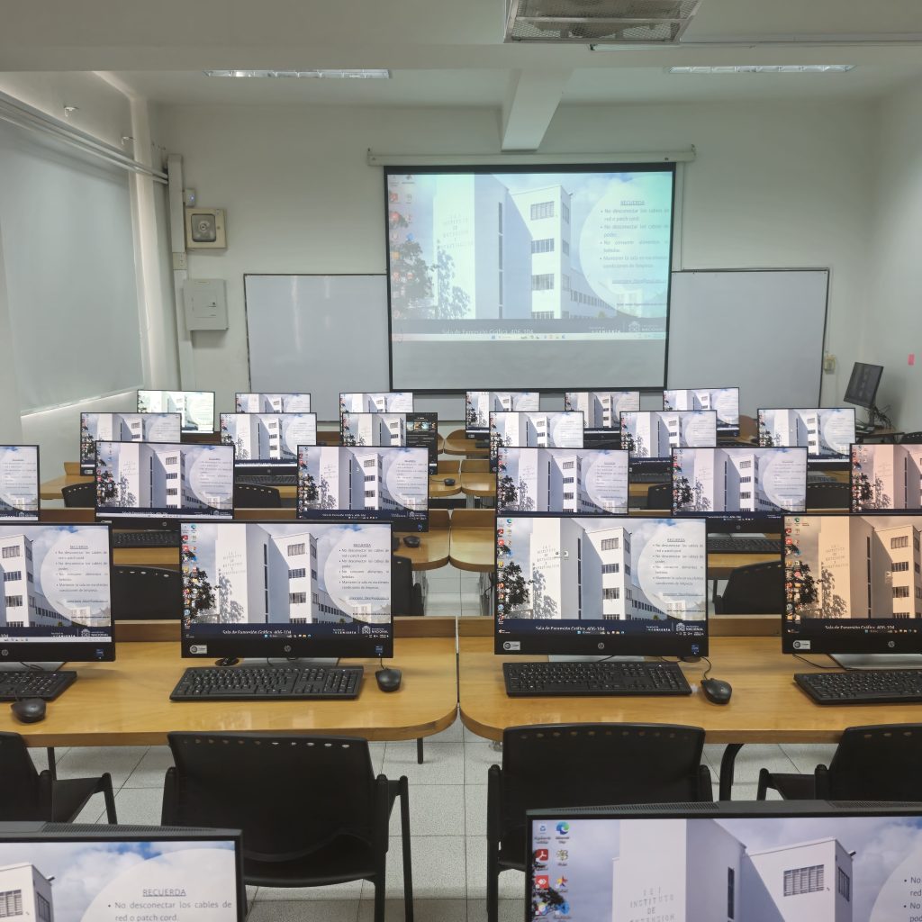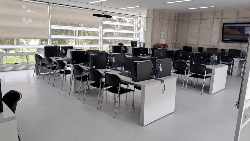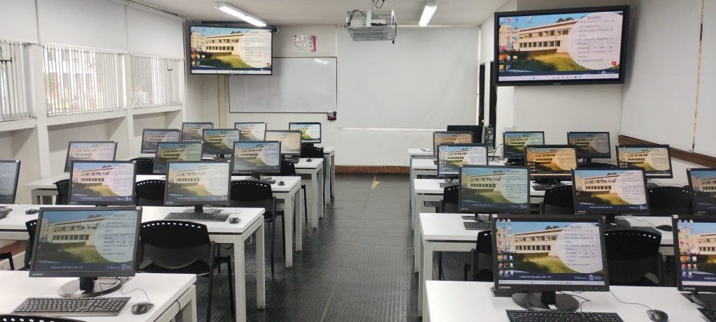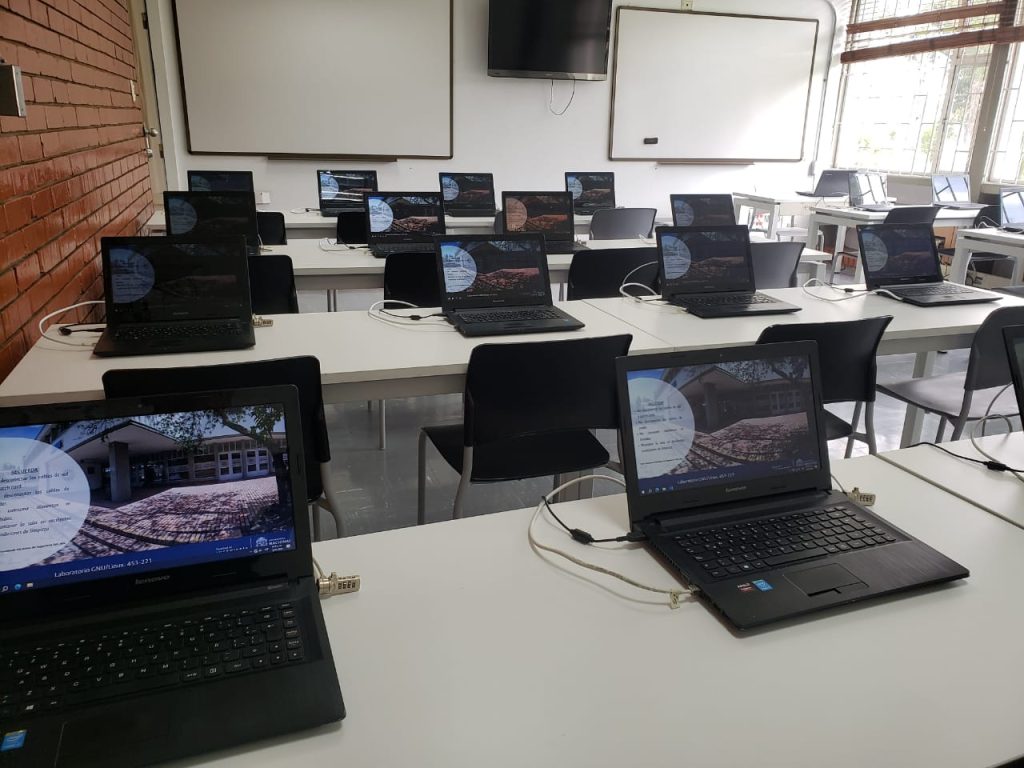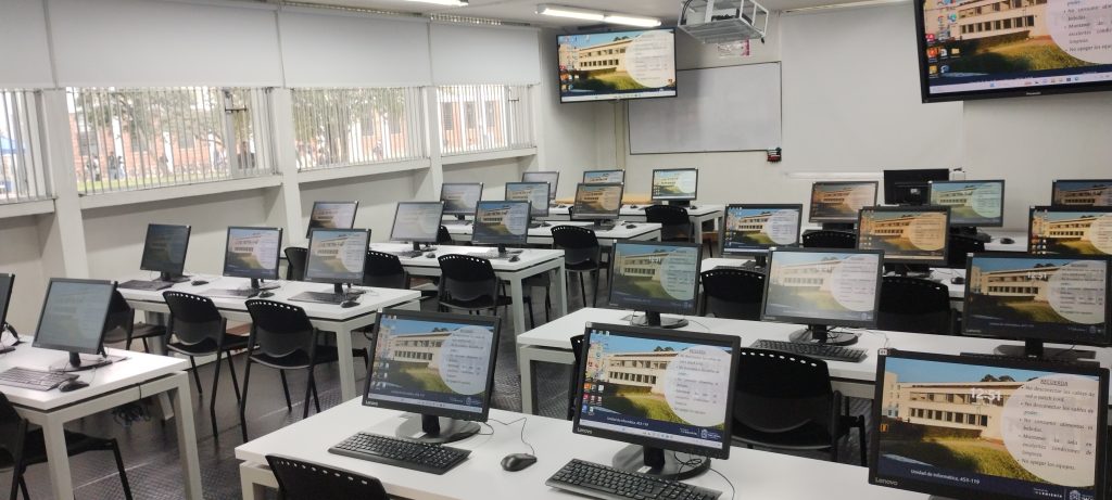 Espacio dedicado a docencia y extensión con equipos modernos (computadores HP, software especializado como Python 3.5, Java, SQL Server, entre otros) y soporte a múltiples cursos y grupos de investigación