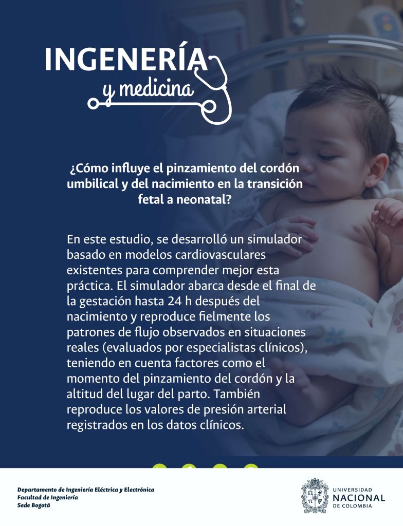 Este proyecto busca entender, mediante simulaciones basadas en modelos matemáticos, cómo distintas prácticas médicas influyen en la adaptación del bebé al ambiente fuera del útero. Por ejemplo, analizamos cómo varía la oxigenación del neonato dependiendo de si se pinza el cordón umbilical inmediatamente después del nacimiento o unos minutos más tarde. También evaluamos escenarios como la altitud, todo con base en ecuaciones que modelan el funcionamiento del sistema cardiovascular y respiratorio durante los primeros minutos de vida.
