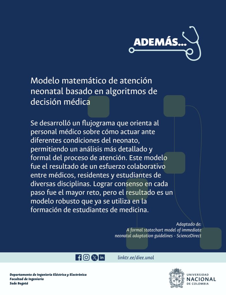 Uno que me entusiasma es el desarrollo de un modelo matemático para representar la guía médica de Adaptación Neonatal Inmediata. Se trata de un diagrama o flujograma que guía al médico sobre cómo actuar ante diferentes condiciones del neonato. Nosotros lo tradujimos a un lenguaje de ingeniería conocido como statecharts, lo que permite un análisis detallado y secuencial de esta guía médica.
